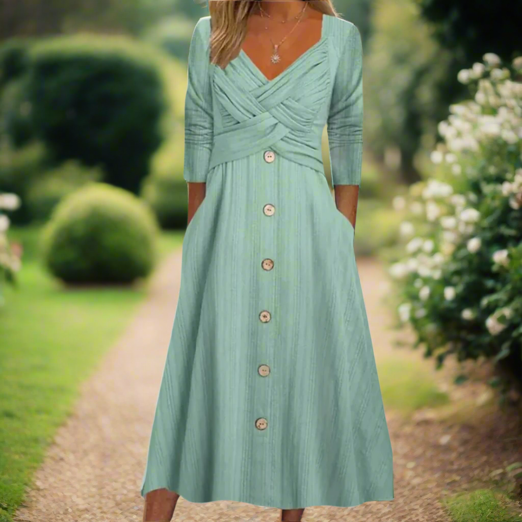 The Eliena™ | Cross-Detail Elegant Gown is trending right now for its colorful, summer-ready look and flattering fit for every woman. Designed to enhance your natural shape, this dress combines chic button details and a sculpting cross design, giving you a graceful silhouette and exuding effortless elegance. Whether you're attending a formal event or a special summer gathering, this gown is perfect for any occasion where you want to make a statement.
