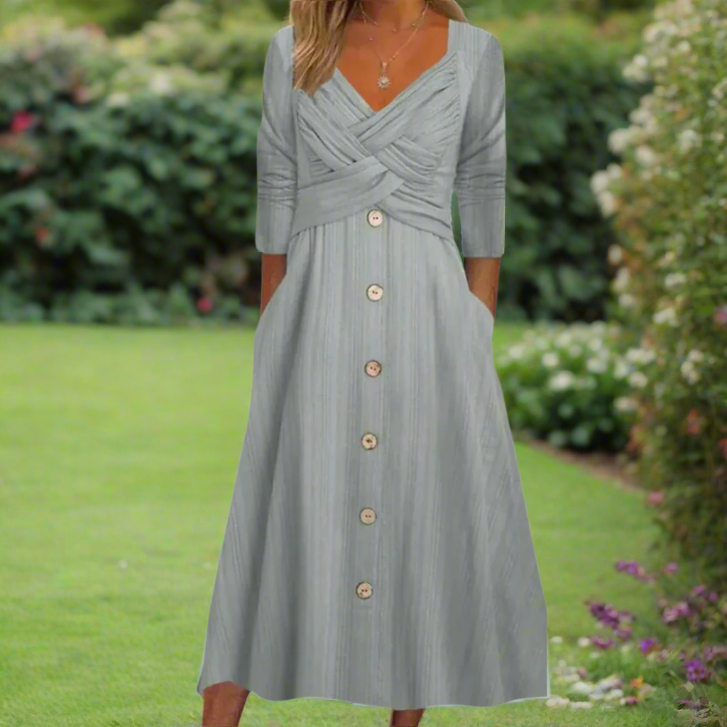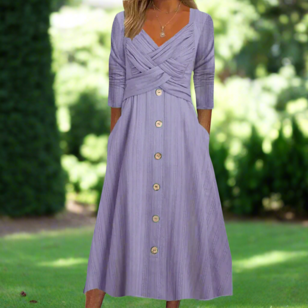 ✔ Style: Elegant gown with cross-detail design and chic button accents.