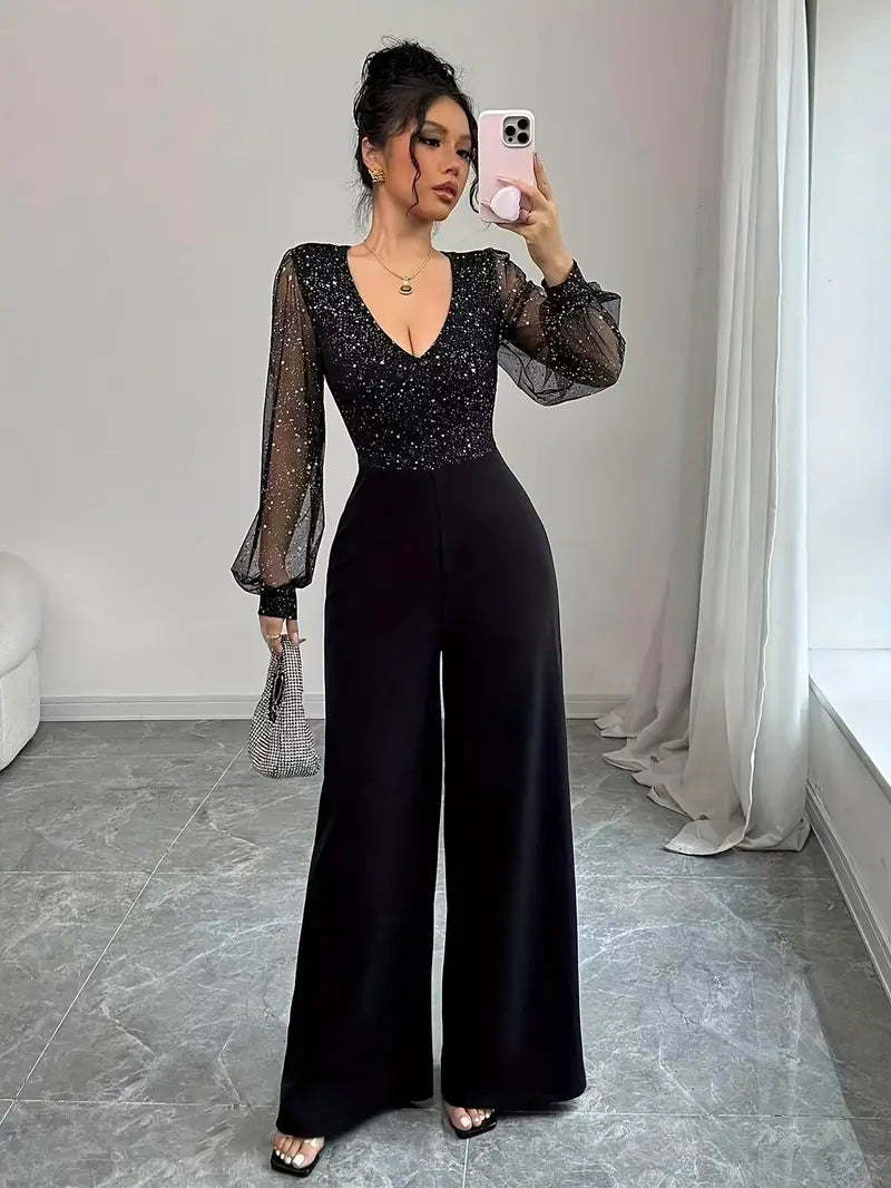Introducing the Fresia™ Elegant V-Neck Jumpsuit — a glamorous black jumpsuit that combines sparkling sequin details with sheer puff sleeves, creating a showstopping look perfect for the festive season. Designed to capture the light and turn heads, this jumpsuit blends timeless elegance with a bold, modern twist.