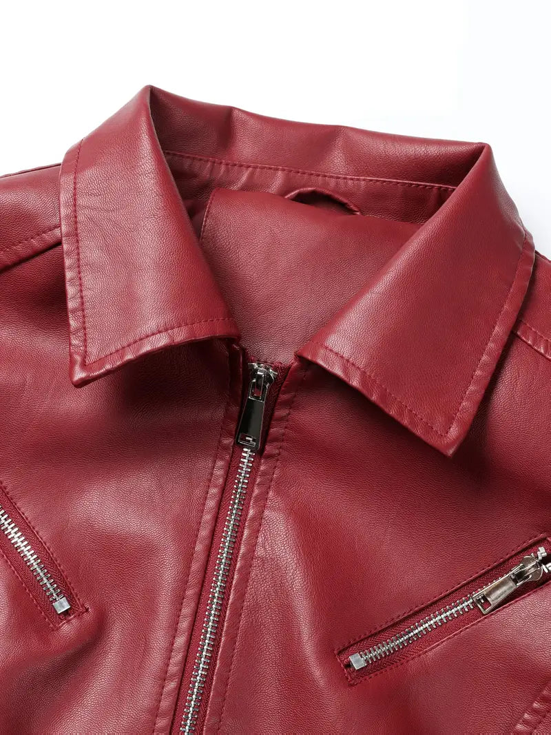 ✔ Timeless Edge – Classic faux-leather biker style with sleek detailing.